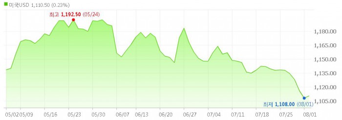 2일 서울 외환시장에서 원·달러 환율은 전 거래일보다 2.0원 오른 1110.0원에 거래를 마감했다. 지난 7월26일 이후 원·달러 환율은 하락세를 보였지만 이날 반등했다.