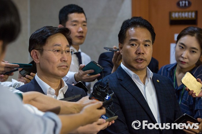 (서울=포커스뉴스) 이용주(오른쪽) 국민의당 의원과 박범계 더불어민주당 의원이 2일 오후 서울 여의도 국회에서 고위공직자 비리수사처 관련 경과 및 향후 일정에 대해 발표를 마친 뒤 취재진 질문에 답하고 있다.