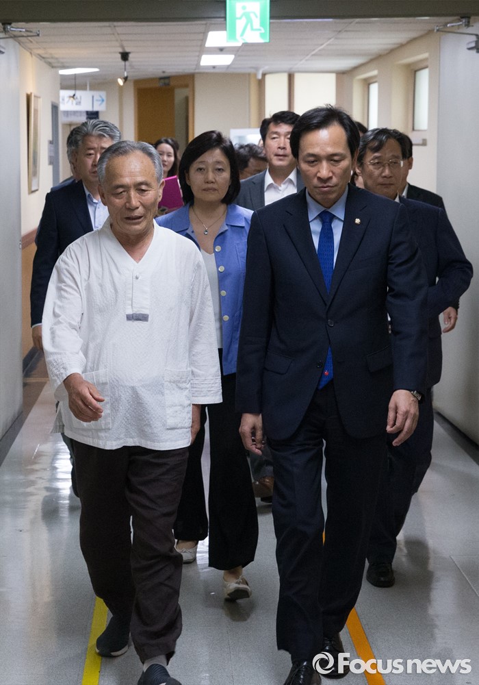 (서울=포커스뉴스) 우상호(오른쪽) 더불어민주당 원내대표등 의원들이 3일 오후 종로구 서울대학교병원을 찾아 지난해 민중총궐기 당시 경찰의 물대포를 맞고 입원 중인 백남기 농민을 위로 방문한 뒤 정현찬 백남기대책위 공동대표의 안내를 받으며 이동하고 있다.