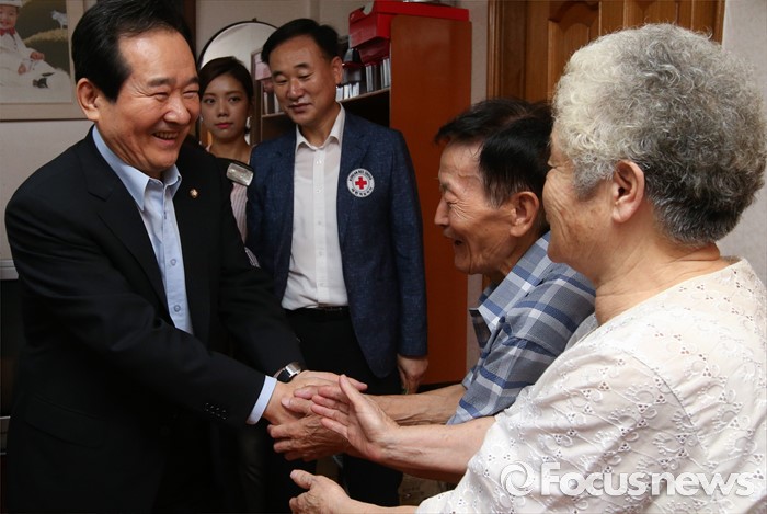 (서울=포커스뉴스) 정세균 국회의장이 2일 오전 서울 종로구 창신동에 거주하고 있는 고령 이산가족 김문각 할아버지(84세, 평안남도 양덕군 청계리) 가정을 방문해 김 할아버지, 아내 이오례 할머니와 인사하고 있다.