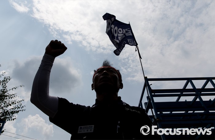 (아산=포커스뉴스) 1일 오후 충남 아산 탕정면 갑을오토텍에서 노조원들이 사측 경비 용역 진입을 반대하며 구호를 외치고 있다.