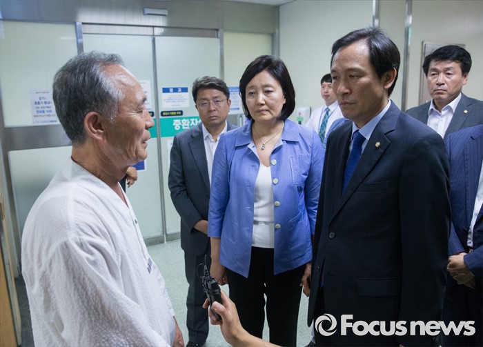 (서울=포커스뉴스) 우상호(오른쪽) 더불어민주당 원내대표와 박영선(가운데) 의원이 3일 오후 종로구 서울대학교병원을 찾아 지난해 민중총궐기 당시 경찰의 물대포를 맞고 입원 중인 백남기 농민을 위로 방문한 뒤 정현찬 백남기대책위 공동대표를 격려하고 있다.