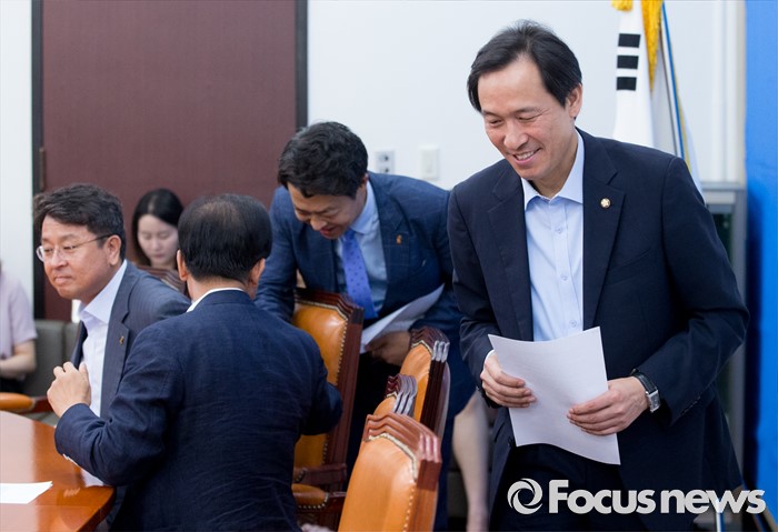 (서울=포커스뉴스) 4일 오전 서울 여의도 국회에서 열린 더불어민주당 사드대책위원회의에 참석한 우상호(오른쪽) 원내대표가 참석하고 있다.
