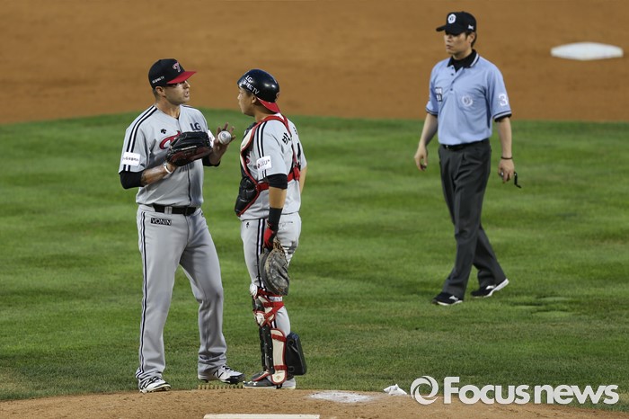 (서울=포커스뉴스) 2일 오후 서울 잠실구장에서 열린 2016 프로야구 LG-두산 경기 3회말 1사 만루 상황에서 폭투로 실점한 LG 투수 허프가 포수 유강남과 대화를 나누고 있다.