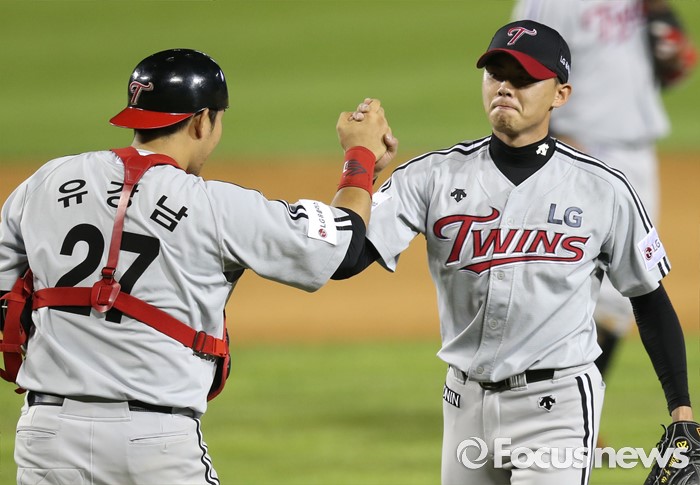 | △ 손을 맞잡는 LG 임정우와 유강남 |