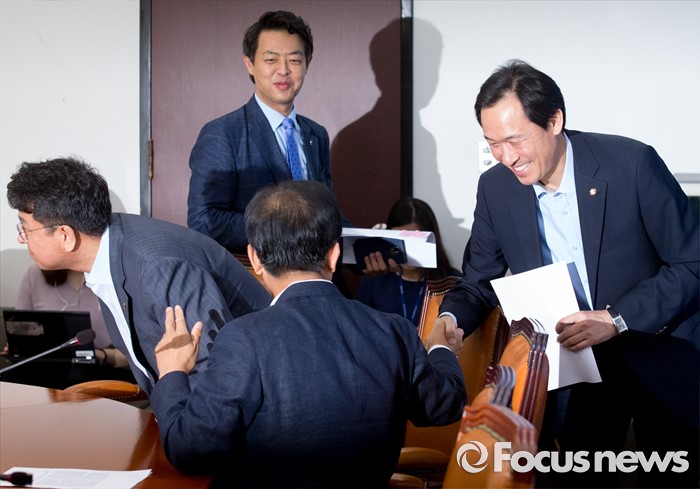 (서울=포커스뉴스) 4일 오전 서울 여의도 국회에서 열린 더불어민주당 사드대책위원회의에 참석한 우상호 원내대표가 동료 의원들과 인사하고 있다.