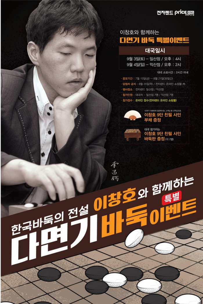 한편, 이창호 9단은 '2016 전자랜드 프라이스킹배 한국 바둑의 전설' 바둑 대회에서 준우승을 차지한 바 있다.이창호 9단과 함께 하는 '다면기 바둑 특별 이벤트'를 알리는 포스터.<사진제공=전자랜드>