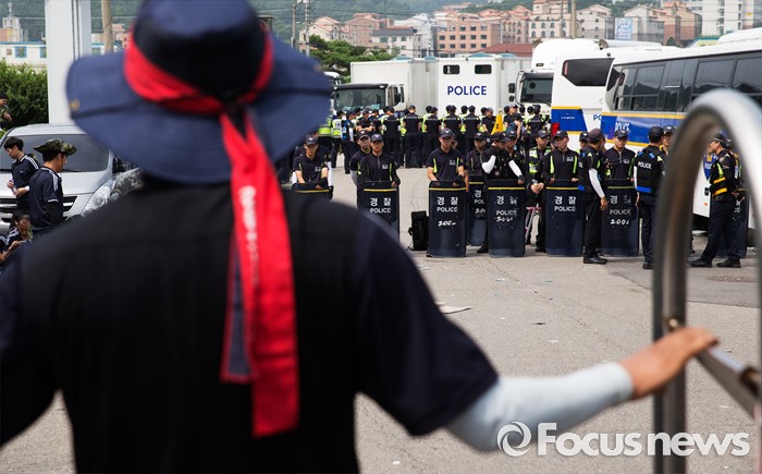 (아산=포커스뉴스) 1일 오전 충남 아산 탕정면 갑을오토텍에서 노조원들이 사측의 경비 용역 투입에 대비하고 있다.