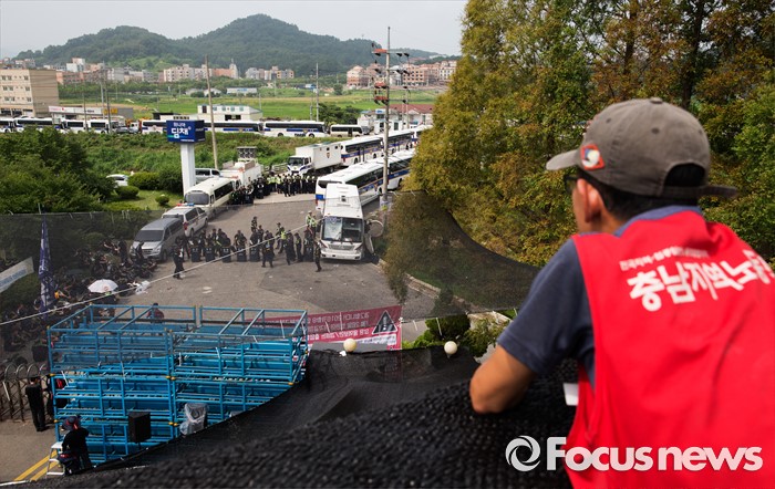 (아산=포커스뉴스) 1일 오전 충남 아산 탕정면 갑을오토텍에서 노조원들이 사측의 경비 용역 투입에 대비하고 있다.