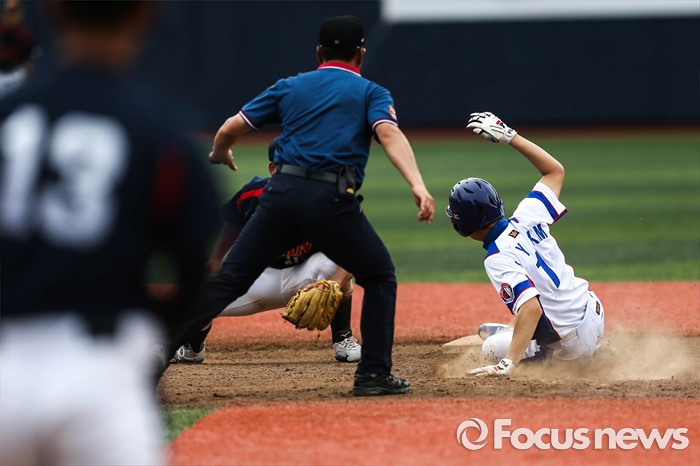 (서울=포커스뉴스) 1일 오후 서울 양천구 목동종합운동장에서 열린 2016 세계 청소년 야구 대회 한국A조와 일본 A조 경기 5회초 1사 상황, 한국A 김주영이 2루 도루를 성공하고 있다.