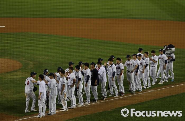 (서울=포커스뉴스) 2일 오후 서울 잠실구장에서 열린 2016 프로야구 LG-두산 경기에서 11점차로 승리한 두산 선수들이 승리를 자축하고 있다.