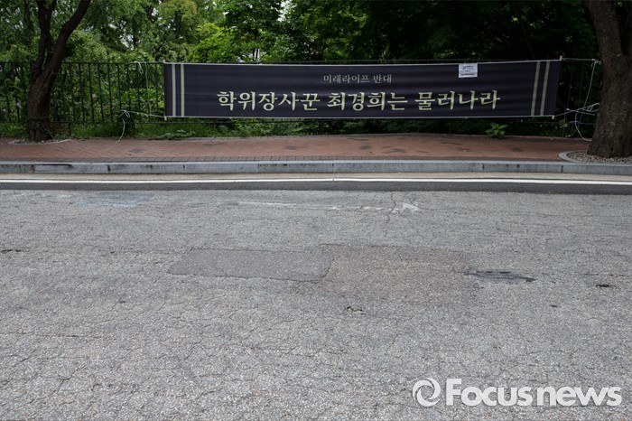 (서울=포커스뉴스) 2일 오전 서울 서대문구 이화여대 교내에 최경희 이화여대 총장의 미래라이프 단과대학 설립 추진을 규탄하는 현수막이 걸려있다.