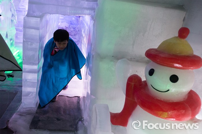 (서울=포커스뉴스) 3일 오후 서울 마포구 아이스뮤지엄을 찾은 한 어린이가 얼음 터널을 지나고 있다.