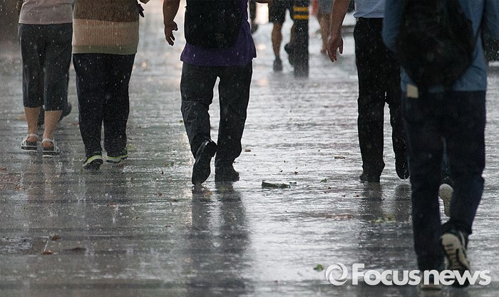 (서울=포커스뉴스) 천둥, 번개를 동반한 강한비가 내린 2일 오후 서울 서초구 교대역 주변에서 시민들이 비를 피해 발걸음을 재촉하고 있다.