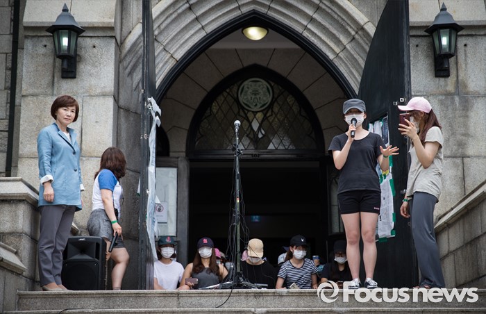 (서울=포커스뉴스) 최경희(왼쪽) 이화여자대학교 총장이 3일 오후 서울 서대문구 이화여대 본관에서 평생교육 단과대학인 '미래라이프대학' 설립 중단 발표를 마친 뒤, 학생들의 발언을 듣고 있다.