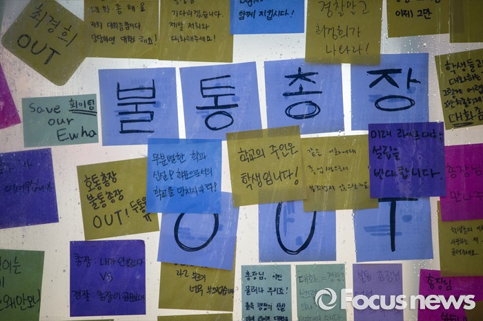 (서울=포커스뉴스) 미래라이프 대학 설립에 반대하는 학생들이 엿새째 이화여대 본관을 점거하고 있는 2일 밤, 서울 서대문구 이화여대 교내에 다양한 목소리의 시위성 글들이 붙어 있다.