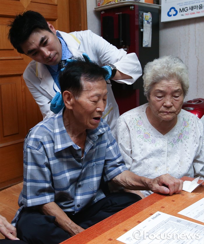 (서울=포커스뉴스) 정세균 국회의장이 2일 오전 서울 종로구 창신동에 거주하고 있는 고령 이산가족 김문각 할아버지(84세, 평안남도 양덕군 청계리) 가정을 방문했다. 김 할아버지가 이산가족 상봉 준비를 위한 유전자 채취를 하고 있다.