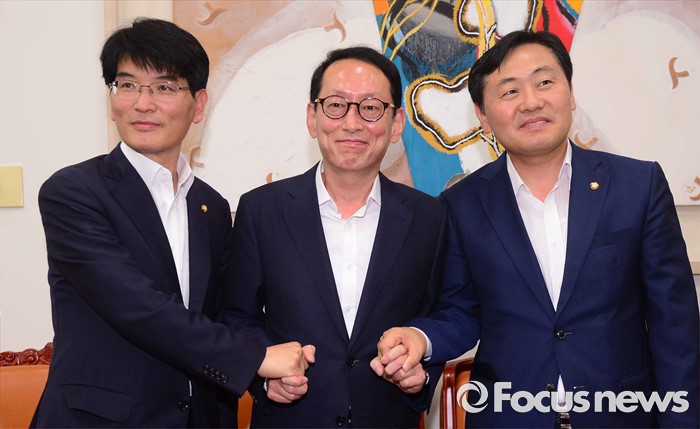 (서울=포커스뉴스) 1일 서울 여의도 국회에서 여야3당 원내수석부대표가 8월 임시국회 세월호 특별법 연장과 추경 등 현안 관련 공조 협의를 위한 회동에서 손을 맞잡고 있다. 왼쪽부터 더불어민주당 박완주, 새누리당 김도읍, 국민의당 김관영.