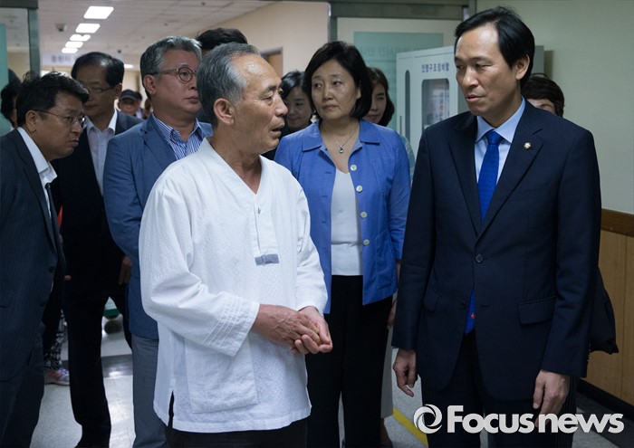(서울=포커스뉴스) 우상호 더불어민주당 원내대표 등 의원들이 3일 오후 종로구 서울대학교병원을 찾아 지난해 민중총궐기 당시 경찰의 물대포를 맞고 입원 중인 백남기 농민을 위로 방문하기 위해 정현찬 백남기대책위 공동대표의 안내를 받으며 이동하고 있다.