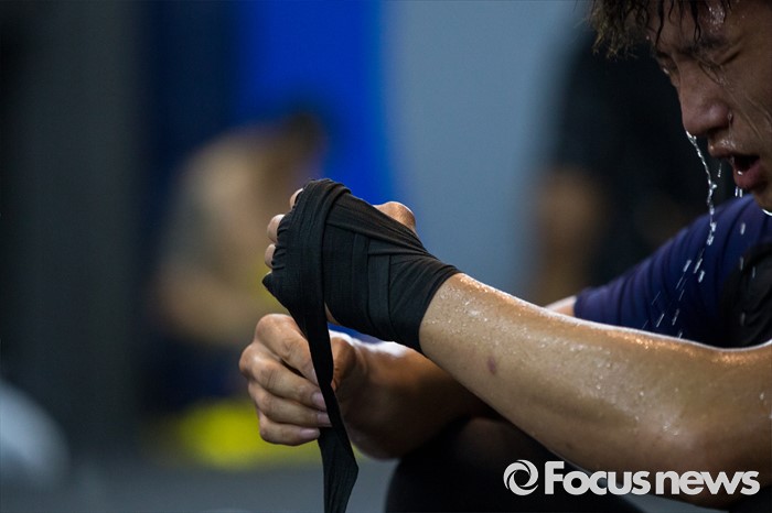 (서울=포커스뉴스) 오는 21일(한국시각) 미국 라스베이거스 T-모바일 아레나에서 개최되는 UFC-202에 출전해 러시아 출신 술탄 알리예프를 상대로 웰터급 경기가 예정된 임현규가 3일 오후 서울 서대문구 TAP복싱 & 레슬링에서 훈련도중 휴식하고 있다.