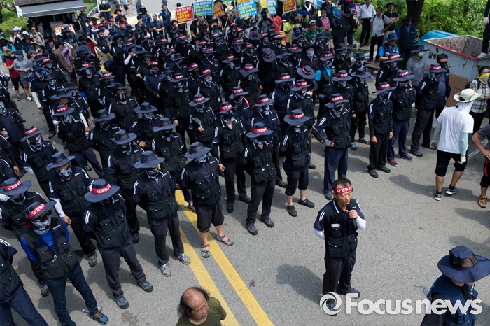 (아산=포커스뉴스) 1일 오후 충남 아산 탕정면 갑을오토텍에서 노조원들이 사측 경비 용역 진입을 반대하며 구호를 외치고 있다.