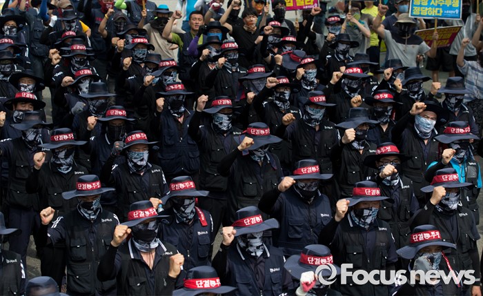 경비 용역 배치 반대하는 갑을오토텍 노조원들