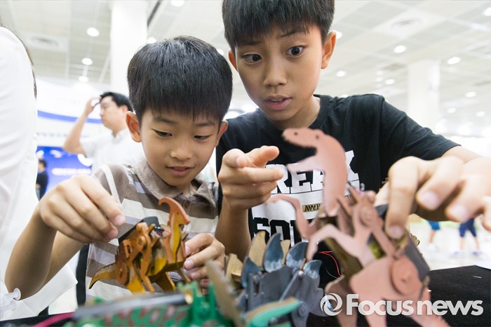 (서울=포커스뉴스) 4일 오전 서울 강남구 코엑스에서 열린 '제20회 대한민국 과학창의축전'을 찾은 시민들이 전동 공룡 장난감을 만지고 있다.
