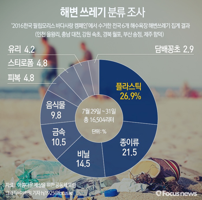 (서울=포커스뉴스) 4일 해양 정화 봉사단체인 '아름다운 세상을 위한 공동체포럼'이 발표한 '해변 쓰레기 분류 조사' 결과에 따르면 여름 해변에 가장 많이 버려지는 쓰레기는 일회용 연질 플라스틱 포장류( 26.9%)로 나타났다.
