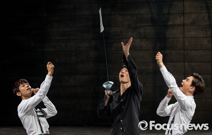 (서울=포커스뉴스) 4일 오후 서울 중구 충무아트센터에서 열린 연극 '햄릿-더 플레이' 언론시연회에 참석한 배우들이 열연하고 있다.