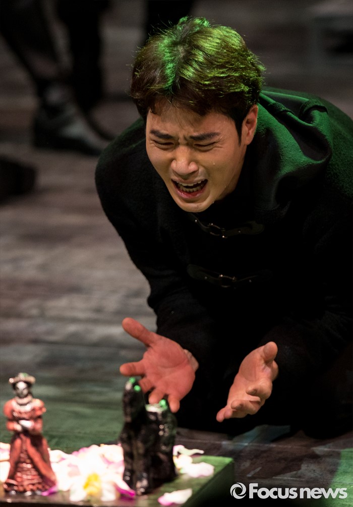 (서울=포커스뉴스) 4일 오후 서울 중구 충무아트센터에서 열린 연극 '햄릿-더 플레이' 언론시연회에 참석한 배우 김강우가 열연하고 있다.