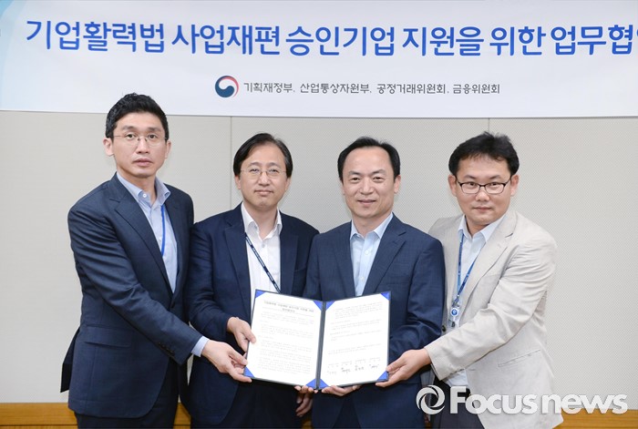 (세종=포커스뉴스) 정대진(오른쪽 두 번째) 산업통상자원부 창의산업정책관이 4일 오후 세종시 정부세종청사 산업부 회의실에서 기획재정부 정책조정총괄과장, 공정거래위원회 시장구조개선과장, 금융위원회 산업금융과장이 참석한 가운데 ‘4개 부처는 오는 8월13일 시행 예정인 기업활력 제고를 위한 특별법(이하 기활법)의 원활한 운영 및 사업재편기업에 대한 효과적인 지원’을 위해 '기업활력법 사업재편 기업지원 업무협약 체결식'을 갖고 기념촬영 하고 있다. <사진제공=산업통상자원부>