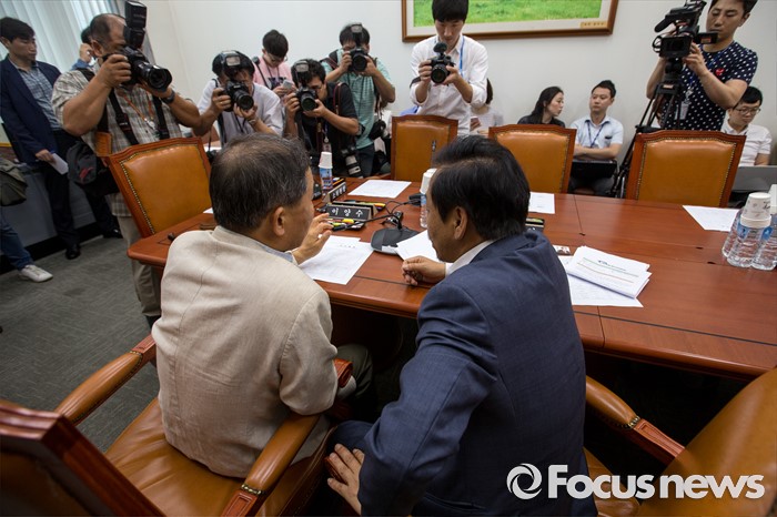 (서울=포커스뉴스) 국회 농해수위 부정청탁금지법 소위 위원장인 황주홍(왼쪽) 국민의당 의원과 이완영 새누리당 의원이 4일 오후 서울 여의도 국회에서 열린 농림축산식품해양수산위원회 부정청탁금지법 관련 소위에 참석해 대화 하고 있다.