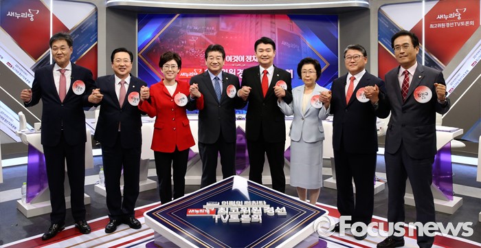 (서울=포커스뉴스) 4일 서울 중구 TV조선 스튜디오에서 열린 새누리당 최고위원 후보자 TV토론회에 참석한 의원들이 포즈를 취하고 있다. 왼쪽부터 정문헌 전 의원, 이장우, 최연혜, 강석호, 정용기, 이은재, 조원진, 함진규 의원.