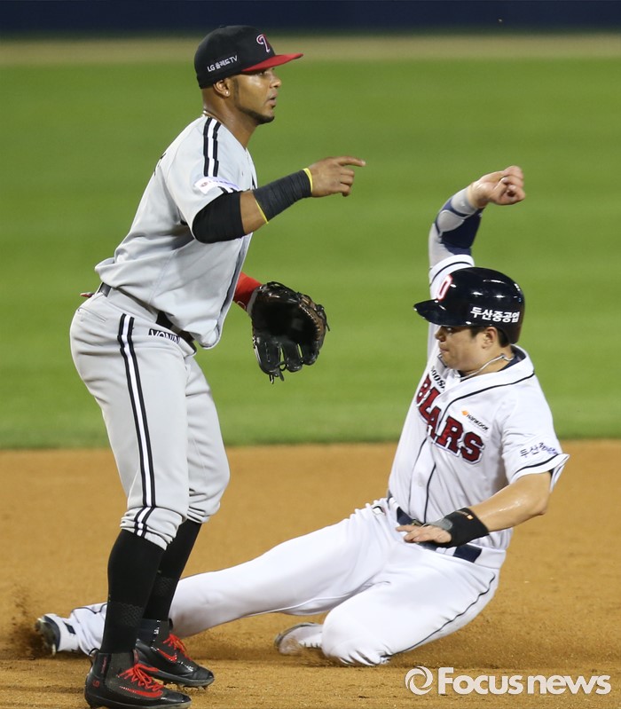(서울=포커스뉴스) 4일 서울 잠실구장에서 열린 2016 프로야구 LG-두산 경기 6회말 무사 1,2루에서 두산 2루주자 김재환이 협살에 걸렸다 3루에서 슬라이딩하며 세이프되고 있다.