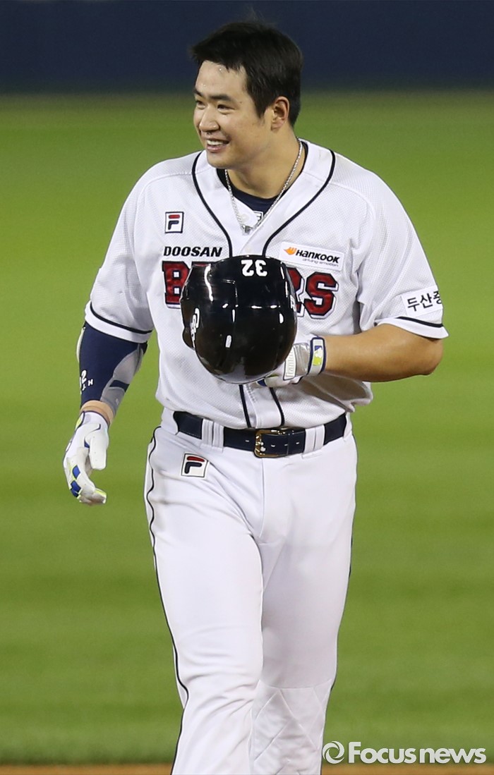 (서울=포커스뉴스) 4일 서울 잠실구장에서 열린 2016 프로야구 LG-두산 경기 6회말 두산 선두타자 김재환이 LG 3루수 히메네스의 수비 시프트로 빈 3루 방향으로 타구를 날려 2루타를 만들고 2루에서 활짝 웃고 있다.
