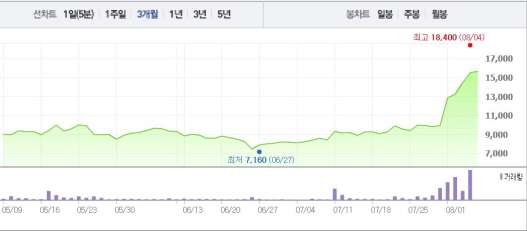 이는 1달 전 주가인 7월5일(8210원)과 비교했을 때 90.62% 상승한 수치다.