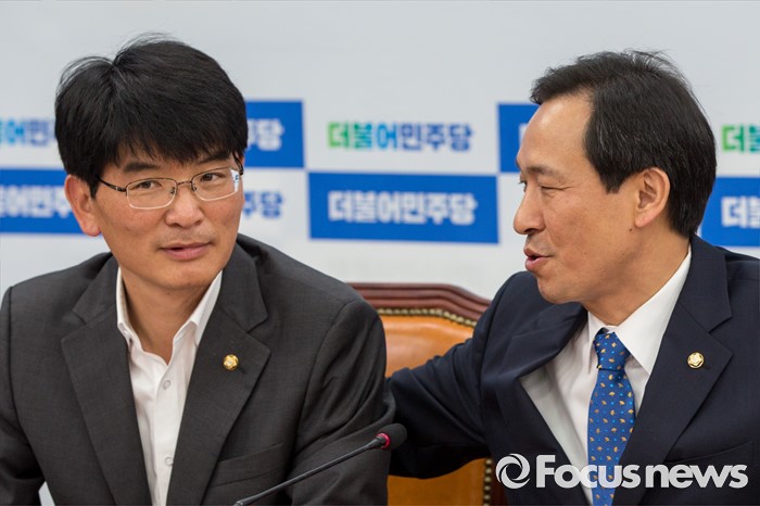 (서울=포커스뉴스) 우상호(오른쪽) 더불어민주당 원내대표와 박완주 원내수석부대표가 5일 오전 서울 여의도 국회에서 열린 상임위원회 간사단 간담회에 참석해 대화 하고 있다.