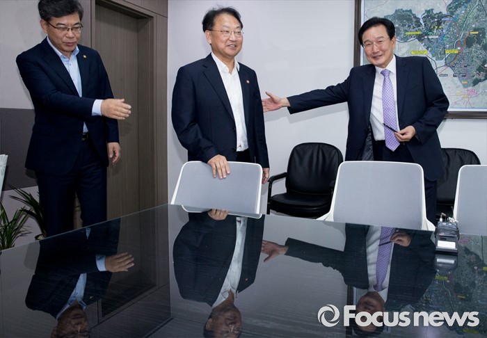 (서울=포커스뉴스) 5일 오전 서울 여의도 국회 의원회관에서 추경 예산 등 협조를 위해 방문한 유일호(가운데) 경제부총리 겸 기획재정부 장관, 송언석(왼쪽) 2차관이 변재일 더불어민주당 정책위의장과 만나 인사한 뒤 자리로 향하고 있다.