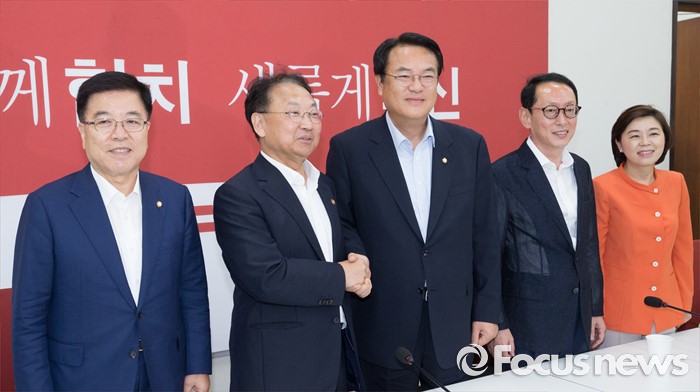 (서울=포커스뉴스) 5일 오전 서울 여의도 국회에서 추경 예산 등 협조를 위해 방문한 유일호 경제부총리 겸 기획재정부 장관이 새누리당 원내지도부와 인사하고 있다. 왼쪽부터 김광림 새누리당 정책위의장, 유 부총리, 정진석 새누리당 원내대표, 김도읍 원내수석부대표, 김정재 원내대변인.