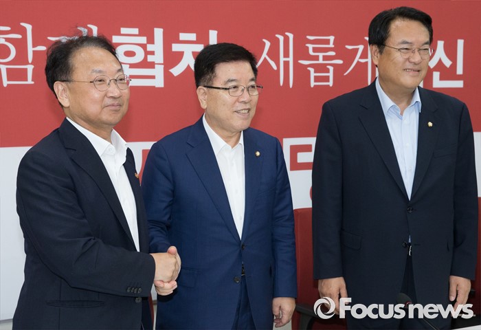 (서울=포커스뉴스) 5일 오전 서울 여의도 국회에서 추경 예산 등 협조를 위해 방문한 유일호 경제부총리 겸 기획재정부 장관이 새누리당 원내지도부와 인사하고 있다. 왼쪽부터 유 부총리, 김광림 새누리당 정책위의장, 정진석 원내대표.