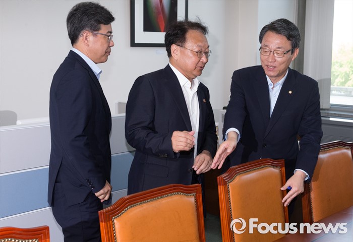 (서울=포커스뉴스) 5일 오전 서울 여의도 국회에서 추경 예산 등 협조를 위해 방문한 유일호(가운데) 경제부총리 겸 기획재정부 장관, 송언석(왼쪽) 2차관이 김성식 국민의당 정책위의장과 만나 인사한 뒤 자리로 향하고 있다.