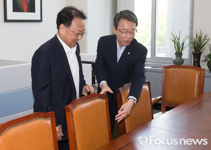 (서울=포커스뉴스) 5일 오전 서울 여의도 국회에서 추경 예산 등 협조를 위해 방문한 유일호(왼쪽) 경제부총리 겸 기획재정부 장관이 김성식 국민의당 정책위의장과 만나 인사한 뒤 자리로 향하고 있다.