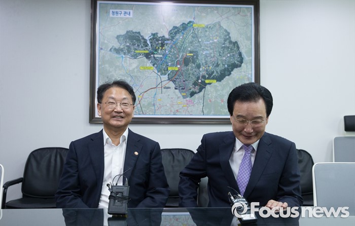 (서울=포커스뉴스) 5일 오전 서울 여의도 국회 의원회관에서 추경 예산 등 협조를 위해 방문한 유일호(왼쪽) 경제부총리 겸 기획재정부 장관이 변재일 더불어민주당 정책위의장과 만나 면담을 하고 있다.