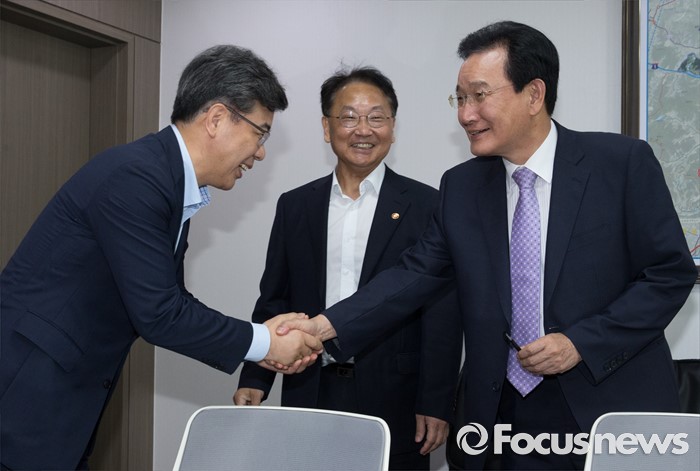 (서울=포커스뉴스) 5일 오전 서울 여의도 국회 의원회관에서 추경 예산 등 협조를 위해 방문한 유일호(가운데) 경제부총리 겸 기획재정부 장관, 송언석(왼쪽) 2차관이 변재일 더불어민주당 정책위의장과 만나 인사하고 있다.
