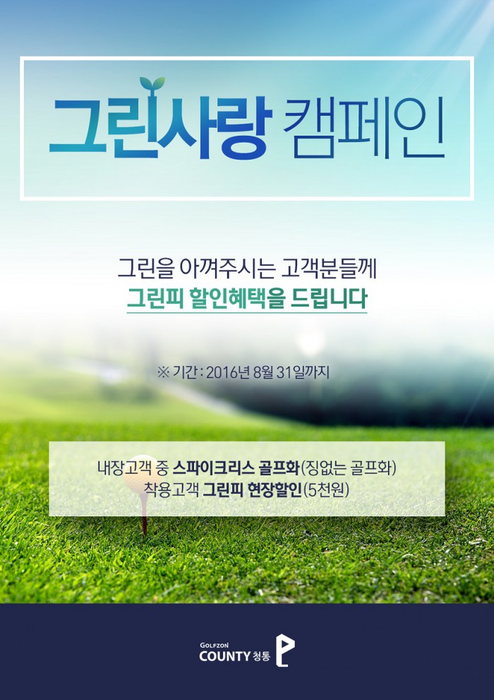 골프존카운티는 우선, 이달 한달간 '그린사랑 캠페인'을 진행한다. '그린사랑 캠페인'은 골프장 잔디 보호를 위해 마련된 행사다. 스파이크리스 골프화를 신고 경북 영천 소재 '골프존카운티 청통'을 방문하면 그린피를 5000원 할인해준다.