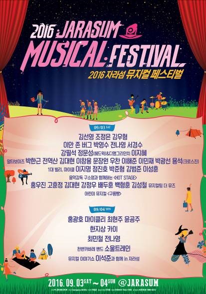 오는 9월3일부터 4일까지 양일간 경기도 가평군 자라섬에서 개최되는 '2016 자라섬 뮤지컬 페스티벌'은 JMF 대극장, JMF 소극장, JMF 심야극장, JMF 시파티 등 크게 4가지 프로그램으로 구성된다.