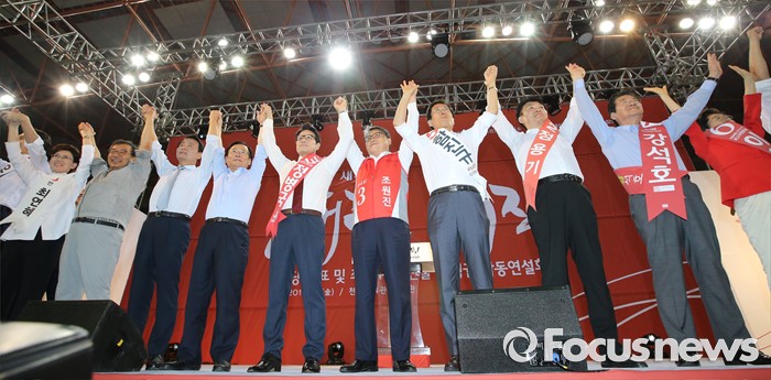 (천안=포커스뉴스) 5일 오후 충남 천안시 유관순체육관에서 열린 새누리당 대표 및 최고위원 선출 충청권 합동연설회에서 당대표 및 최고위원에 출마한 후보들이 당원들에게 인사하고 있다.