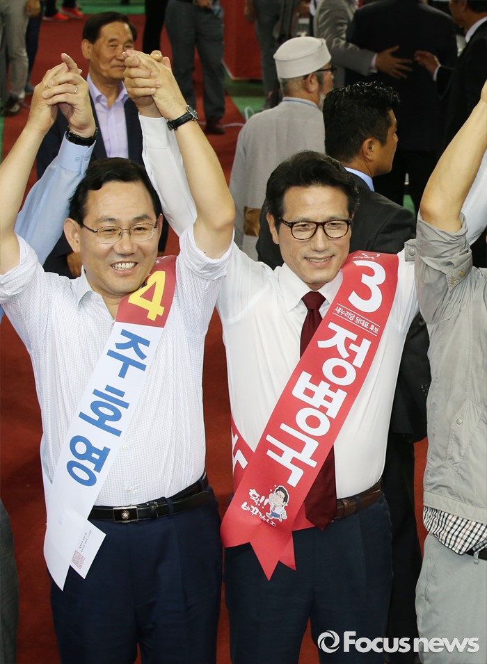 (천안=포커스뉴스) 5일 오후 충남 천안시 유관순체육관에서 열린 새누리당 당 대표 및 최고위원 선출 충청권 합동연설회에서 당 대표에 출마한 주호영(왼쪽) 후보와 정병국 후보가 손을 잡고 당원들에게 인사하고 있다.