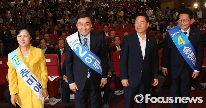 (서울=포커스뉴스) 더불어민주당 대표선출을 위한 예비경선대회가 열린 5일 오후 서울 여의도 국회 의원회관에서 후보들이 참석자들에게 인사하고 있다. 왼쪽부터 추미애, 이종걸, 김상곤, 송영길 후보.