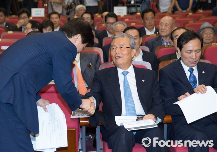 (서울=포커스뉴스) 5일 오후 서울 여의도 국회 의원회관에서 열린 더불어민주당 당대표 선출을 위한 예비경선대회에 김종인(가운데) 비대위 대표와 노웅래(왼쪽) 선거관리위원장이 인사하고 있다. 오른쪽은 우상호 원내대표.